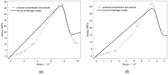 (a) Comparison of the damage model and test results after 0 dry-wet cycle; (b) Comparison of damage model and test results after 5 dry-wet cycles; (c) Comparison of damage model and test results after 15 dry-wet cycles; (d) Comparison of damage model and test results after 20 dry-wet cycles; (e) Comparison of damage model and test results after 30 dry-wet cycles; (f) Comparison of damage model and test results after 60 dry-wet cycles.