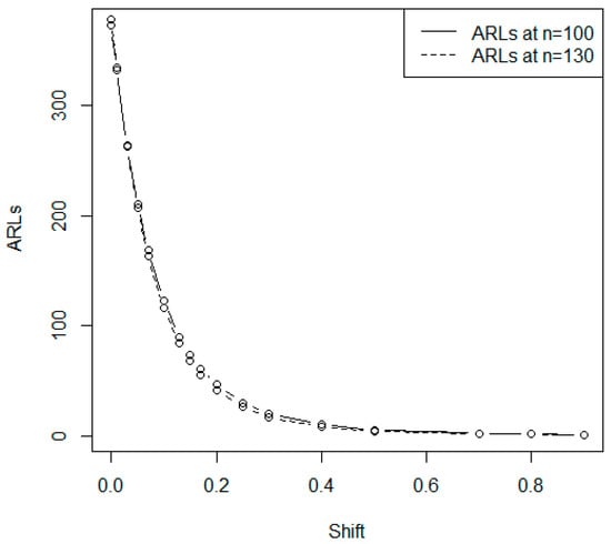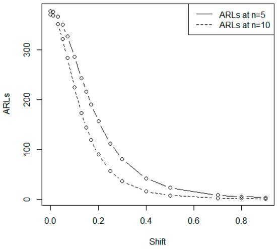 In this section, the advantages of the proposed chart over the existing chart by [] based on MDS sampling are presented. As mentioned earlier, the proposed attribute chart is equal to the [] chart when . Therefore, using the same parameters and setting the ARL1 values from the proposed chart and [], the results are reported in Table 4 for  and  = 300. A control chart having the smaller values of ARL1 of the same parameters is considered as the more efficient chart. From Table 4, it can be noted that the proposed control chart has a smaller ARL1 as compared to the [] chart. For instance, a shift of 1.20 is detected by an average of 109 samples, while the existing chart detects the same shift with an average of 89 samples. Figure 6 is presented for  = 2 and  = 370. From Figure 6, it is clear that the ARL curve for  is higher than the ARL curve when .