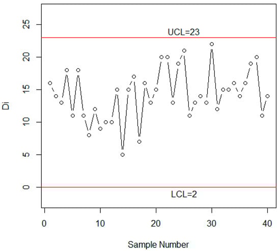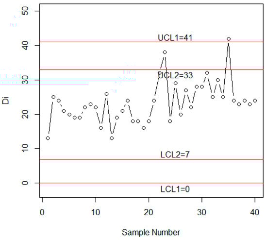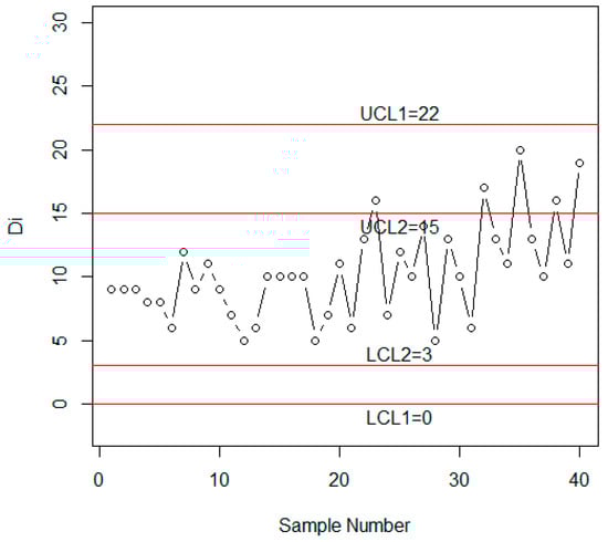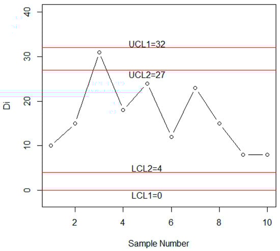Now the application of the proposed control is given on real data from the plastic parts manufacturing industry. According to [] “a control chart is used to control the fraction nonconforming for a plastic part manufactured in an injection molding process”. Ten subgroups each of size 100 are taken from []. The number of non-confirming data is:  = 10, 15, 31, 18, 24, 12, 23, 15, 8 and 8 being noted down and presented here. Figure 5 shows the control chart with k1 = 4.340957 and k2 = 3.092937, and the control chart limits are calculated as LCL1 = 0, LCL2 = 4, UCL2 = 27, and UCL1 = 32. From Figure 5, it can be noted that although the process is in a state of control, the 3rd, 9th and 10th sample are near the control limits, which may cause the shift in the process.