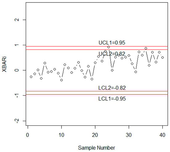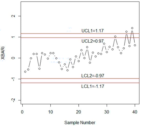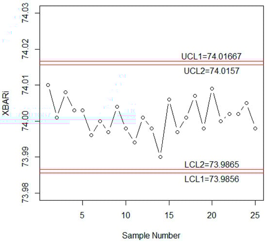 Now the application of the proposed control is given on real data from the automobile industry. A control chart is used to control the mean value inside diameter measurements (mm) for automobile engine piston rings. Twenty-five subgroups each of size 5 are taken from []. Figure 10 shows the control chart with two pairs of limits for the data. From Figure 10, it can be noted that although the process is in a state of control, sample 14 is near the control limits, which needs the attention of industrial engineers.