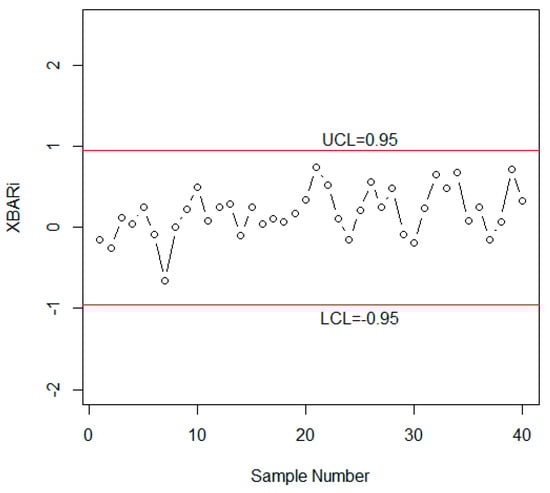 To compare the proposed control chart with the existing chart by [], the values of statistic  are also plotted on a control chart in Figure 8. By comparing Figure 7 with Figure 8, it can be noted that the existing control chart by [] does not have ability to detect the shift in the process. Figure 8 shows that the process is in-control. Similarly, the values of statistic  are also plotted on the Shewhart control chart in Figure 9. From Figure 9, it can be observed that the Shewhart control chart does not detect the shift in the process. Therefore, the current chart is more efficient than two existing control charts in detecting quick shift in the manufacturing process.