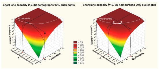 p = 0.27 ordinate on the surface of nomograph we reach intersection with line for percentile 99 - point “a”. By following the 99 percentile line we reach point “b”. From it, using the surface of nomograph we descend using ordinate reaching Queue lengths value which asses the value of capacity of short lane