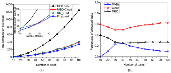 In Figure 2, we vary the number of tasks from 10 to 100 and evaluate the offloading performance. Figure 2a compares the performances of our proposed approach and three other schemes. It is shown that when the number of tasks increases, the total computation overhead of all schemes increases, especially in MEC only scheme. Due to the resource bottleneck of the MEC server, the completion time of tasks of MEC only scheme significantly increases and its effect dominates the total computation overhead. Hence, the performance of MEC only scheme is the worst in most cases (except in case the number of tasks is small enough for MEC to handle, e.g., ). In MEC + Cloud scheme, although there is monetary cost for using the cloud resources, the remote cloud can help the overloaded MEC to execute the increasing number of tasks so that the completion time of tasks can be significantly reduced. Hence, the performance of MEC + Cloud scheme becomes much better than that of MEC only scheme when the number of tasks gets larger. In RO_ECM scheme, besides MEC and remote cloud, the MEC provider can also utilize MVNs. However, in this case, randomly assigning tasks to computing nodes with equal probability will not provide a stable and optimal solution. From Figure 2a, when the number of tasks is , the performance of RO_ECM scheme is even worse than that of MEC only scheme. Meanwhile, our proposed scheme can always achieve the best total computation overhead because it comprehensively considers both the completion time and monetary cost for using computing resources on MEC, remote cloud and MVNs. Figure 2b shows the task distribution on MEC, remote cloud and MVNs of the proposed scheme under different number of tasks. It can be observed that when the number of task is small (), the percentage of tasks allocated to MVNs is equal to 0. It means that the tasks can be executed optimally by using MEC and remote cloud and without using MVNs. It is the reason why the performance of our proposed scheme is the same as that of MEC + Cloud scheme in case as shown in Figure 2a. When the number of tasks increases from 10 to 40 tasks, the percentage of tasks allocated to MVNs increases until the maximum number of MVNs () is utilized (at tasks). Meanwhile, the percentages of tasks allocated to MEC and remote cloud decrease. When the number of tasks is greater than 40 tasks, the percentage of tasks allocated to MVNs decreases while the percentages of tasks allocated to MEC and remote cloud increase. It is because there are no more MVNs that can receive the offloaded tasks and the tasks will be executed on MEC or remote cloud. Moreover, it can also be seen that the percentage of tasks allocated to remote cloud is greater than the percentage of tasks allocated to MEC when the number of tasks increases.
