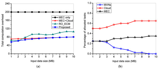 In Figure 3 and Figure 4, we evaluate the offloading performance with respect to the computation task’s profiles in terms of input data size ’s and computation intensity ’s, respectively. Figure 3a shows that when the input data size increases, the total computation overhead of MEC only scheme remains unchanged since there is no offloading. However, the performance of MEC only scheme is the worst due to the high completion time of tasks on MEC. RO_ECM scheme performs better than MEC + Cloud scheme when the input data size is small (e.g., in case MB and MB), however, the performance of RO_ECM scheme significantly decreases and becomes worse than that of MEC + Cloud scheme when the input data size increases. Meanwhile, our proposed scheme performs the best when the input data size is small. When the input data size is large enough (9 MB in this case), the total computation overhead of our proposed scheme can reach that of MEC + Cloud scheme. It is caused by the gradual decrease to 0 of the percentage of tasks allocated to MVNs when the input data size increases as seen in Figure 3b. The reason for this is that by increasing the input data size, the transmission time of input data to MVNs significantly increases. Due to the unstable connection with MEC of MVNs, a computation task with small data size is more preferable to be offloaded to MVNs than one with high data size. Instead of being offloaded to MVNs, the tasks with high data size can be executed by using MEC and remote cloud. From Figure 4a, we can observe that the total computation overhead of all schemes increases with the number of CPU cycles required to accomplish the tasks. Similarly, the performance of MEC only scheme is the worst due to the resource bottleneck of the MEC server. In general, RO_ECM performs better than MEC + Cloud scheme since the MVNs can help alleviate the workload of MEC and remote cloud as the computation intensity of tasks increases. Meanwhile, our proposed scheme can always achieve lower total computation overhead than both MEC + cloud scheme and RO_ECM scheme by performing optimal task distribution on MEC, remote cloud and MVNs as can be seen in Figure 4b. It shows that the proposed scheme utilizes the maximal number of MVNs (i.e., ) when the computation intensity of task increases.