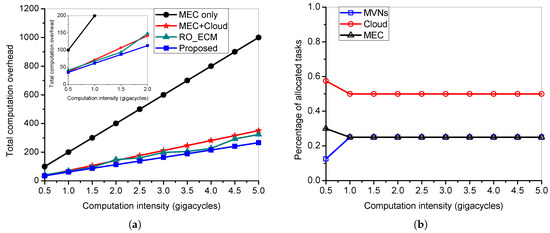 Performance evaluation under different tasks’ computation intensities. (a) Comparison of our proposed scheme and three other schemes; (b) Task distribution of the proposed scheme.