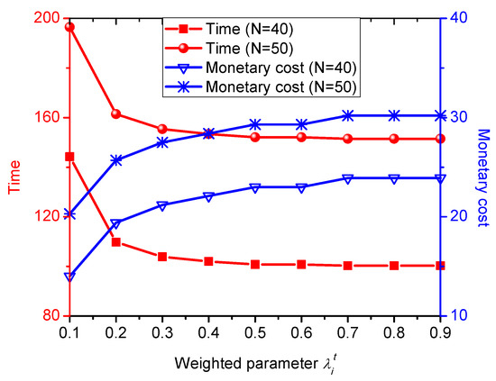 Finally, by varying the weighted parameter of the completion time from 0.1 to 0.9 with a step deviation of 0.1 and setting the weighted parameter of resource cost as , we can also analyze the effect of the weighted parameters on the completion time of all tasks and monetary cost for using computing resources. It can be seen from Figure 6 that the changing trends in terms of the completion time and resource cost are the same in both cases where the number of tasks is and . It is that the completion time of tasks decreases with the increase of monetary cost for using computing resources when increases. In addition, when , the completion time of tasks and monetary cost is higher than in the case when . It is also highly noticeable that the completion time of tasks and the monetary cost significantly decreases and increases, respectively, when the value of changes from 0.1 to 0.2. Therefore, selection of the weighted parameters plays an important role in the achieved completion time of tasks and monetary cost for using computing resources.
