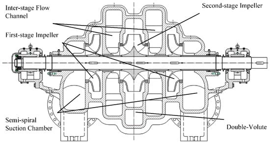 where the Q is the mass flow rate, m3/s; n is the rotating speed, 750 rpm; H is the head of the pump, m. The pump consists of two suction chambers and two parallel two-stage impellers with a common shaft in the same casing. The horizontal split pump case is used. A cross-section view of the pump is shown in Figure 1. The two-stage double-suction centrifugal pump has two semi-spiral suction chambers symmetrically distributed on the left and right sides, leading the fluid to the first-stage impellers on each side, respectively.