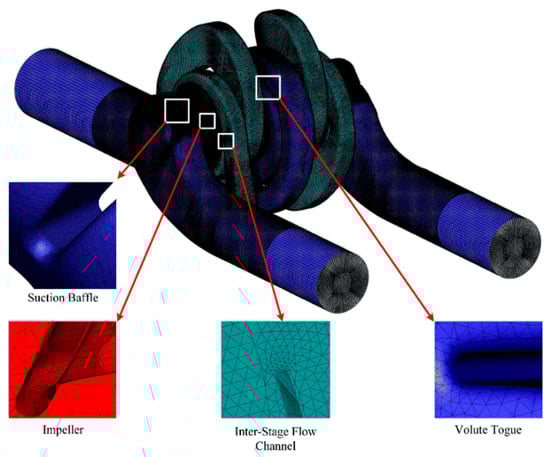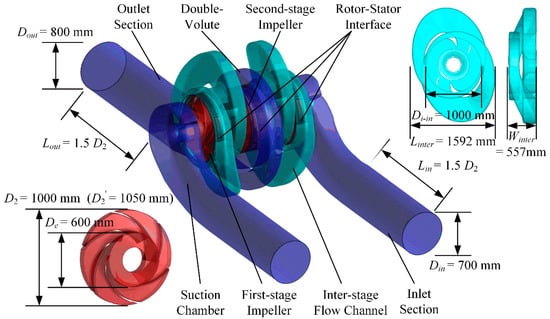 The inter-stage flow channel transports the outflow of the first-stage impeller to the inlet of the second-stage impeller. The main function of the inter-stage flow channel is to convert kinetic energy into pressure energy by reducing the velocity with a minimum loss [18]. It has to make a 180° turn to direct the flow into the second-stage impeller. The second-stage impeller is a double-suction impeller whose trailing edge is parallel with the pump shaft. The fluid on both sides is gathered in a common volute. Both the first-stage impeller and the second-stage impeller have six blades. The inlet diameter of the pump is the same as the volute outlet diameter.