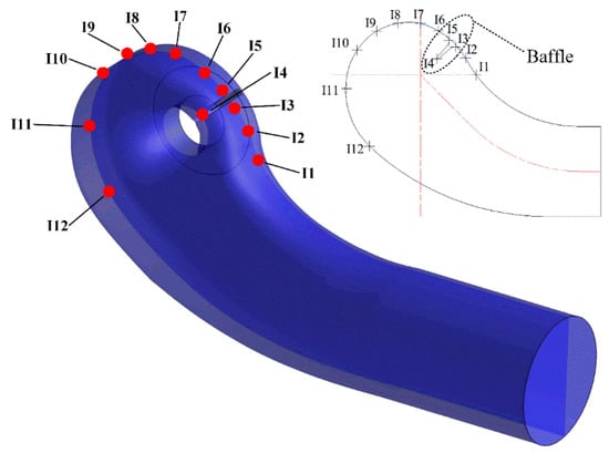 The monitor points at different positions of different components of the pump are shown in Figure 3, Figure 4, Figure 5 and Figure 6. Monitor Points I1–I12 were set at the middle section of the suction chamber (Figure 3). The points are numbered by order from upstream to downstream. Points I3–I5 were set around the baffle as shown in Figure 3.