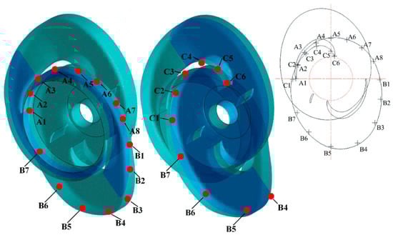 The structure of the inter-stage flow channel is complex with a 180° turnaround channel, as shown in Figure 4. The inter-stage flow channel is divided into three parts as the exit section, corner section, and confluence section. Points A1–A8 were set at the exit section. Monitor Points B1–B8 were set at the corner section. Monitor points C1–C6 were set at the confluence section. A1–C6 are continuously distributed from the upstream to the downstream.