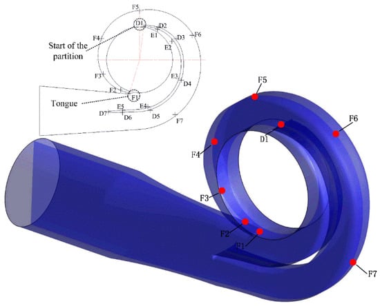 The double volute structure is used in the two-stage double-suction centrifugal pump. Monitor points were set along the flow direction within the flow channel. Point F1 is on the head of the volute tongue, and Point D1 is on the head of the partition, as shown in Figure 5.