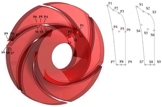 Monitor points were set at the leading edge, middle part, and the trailing edge of both the pressure side and suction side of the blade in the two impellers, as shown in Figure 6. At every position, there are three monitor points from the hub side to the shroud side. The monitor points on the pressure side of the first-stage impeller are from P11–P19. They are from P21–P29 for the second-stage impeller. The monitor points on the suction side of the first-stage impeller are from S11–S19. They are from S21–S29 for the second-stage impeller. All the monitor points are rotating with the impeller.