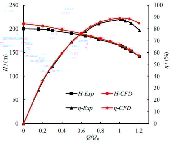 Figure 9 shows the simulated performance curve with different flow rates compared to the experimental results by using the final fine grid. The experimental test was finished in the pump test bench of Shanghai Liancheng Company(Shanghai, China), and the total test error of the experiment was ±0.5% [24]. The maximum deviation of the simulation results was 6.2% and 6.7% for efficiency and head, respectively, while the average deviation was 2.3% and 1.7%, respectively. Meanwhile, the trend of the simulation results was the same as that of experimental values, which verifies the current grid and numerical method.