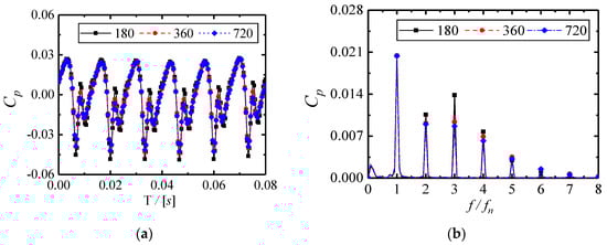 The time step of unsteady simulation plays an important role in the balance between calculation precision and computational cost. Three different time steps with 180 steps, 360 steps, and 720 steps respectively in one rotation period were compared in this paper. The corresponding sampling frequency was 2250 Hz, 4500 Hz, and 9000 Hz, which was at least 30 times that of the BPF. The harmony of the fluctuation is usually around 10 times that of the BPF, so the time step chosen above is sufficient. Figure 10 shows the dimensionless pressure coefficient distribution of the monitor point F1 at the head of the volute tongue. Both the time domain and frequency domain distribution were obtained. The pressure coefficient Cp is defined as: