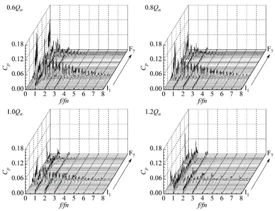 Figure 11 shows the frequency distribution of pressure fluctuation in the two-stage double-suction centrifugal pump from the inlet of the suction chamber to the outlet of the volute under four typical flow rates. The X coordinate is the dimensionless frequency divided by the BPF fn, which was 75 Hz. The Y coordinate is the order of the monitor points, which was from I1–I12, P11–P19, A1–C6, P21–P29, and F1–F8, and the Z coordinate is the pressure coefficient Cp. It can be seen that the pressure fluctuation of the two-stage double-suction centrifugal pump was mainly based on the BPF and its harmonics under the four typical flow rates. BPF and its first harmonic existed at each monitor point of the pump.