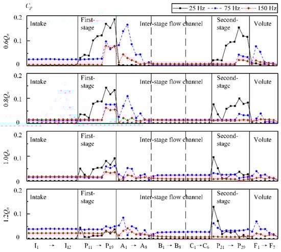 It can be found in Figure 11 that the pressure fluctuations in the impellers were different from those at other positions. Broadband fluctuations with wide bandwidth occurred near the exit of the pressure side of the two impellers (Monitor Points P17~P19 and P27~P29), especially under part load conditions. The bandwidth of the broadband was obviously narrowed as the flow rate increased. The bandwidth of the second-stage impeller was smaller than that of the first-stage impeller. At 1.2Qn, the broadband almost disappeared in the second-stage impeller, and only BPF and its harmonics remained. Figure 12 shows the pressure fluctuation amplitude distribution at BPF (75 Hz), the first harmonic of BPF (150 Hz), and the first harmonic of RF (25 Hz) along the flow direction in each part of the two-stage double-suction centrifugal pump under four typical flow rates. It can be found that a component with a frequency of 25 Hz showed the strongest fluctuation under each flow rate especially under 0.6Qn and 1.2Qn in both the first-stage impeller and the second-stage impeller. A high pressure fluctuation amplitude with BPF was also found in both the inter-stage channel and the volute. Pressure fluctuations with BPF and its harmonics and fluctuations with the first harmonic of the RF are discussed in detail in the following sections.
