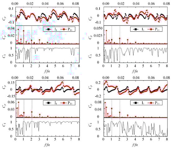 In this paper, the monitor points at the impeller rotated with the impeller. It was found that the fluctuation amplitudes at BPF and its first harmonic at both the leading edge and the middle of the blade (P11–P16) were the same as that of the suction chamber. In order to explore the relationship between the suction chamber, the leading edge, and the middle of the impeller, the time domain characteristic, the frequency domain characteristic, and coherence analysis were conducted. Figure 13 shows the comparison under the four typical flow rates of the monitor point I1 at the suction chamber and the monitor point P11 at the leading edge of the first-stage impeller. The coherence coefficient C1 is defined as,