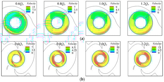 Figure 14 shows the velocity distributions at the inlet of the two impellers. It was found that the velocity distributions did not change with time. For the velocity distribution at the first-stage impeller inlet, there was a symmetrically-distributed high velocity zone under 0.6Qn as shown in Figure 14a. However, as the flow rate gradually increased, the symmetrical high velocity distribution disappeared, and a high-speed zone appeared in the direction of the suction chamber inlet. The high-speed zone also appeared in front of the second-stage impeller. The area of the high-speed zone increased as the flow rate increased, but the distribution of the high-speed zones was not the same as that in the first-stage impeller. There was a pair of symmetrically-distributed high-speed zones in front of the second-stage impeller inlet. Under 0.6Qn, as shown in Figure 14b, the area of the symmetrically-distributed high-speed zone around the impeller inlet was small, and the velocity was relatively lower. With the increase of the flow rate, starting from the 0.8Qn condition, the area and the velocity gradient of the symmetrically-distributed high-speed zone increased gradually.
