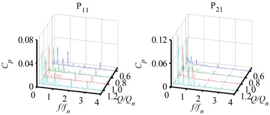 Comparing the pressure fluctuation distribution in frequency domain at the monitor point P11 in the first-stage impeller and the monitor point P21 in the second-stage impeller under different conditions (Figure 15), it can be found that the fluctuation with the first harmonic of RF at the two impellers increased with the flow rate obviously. The main frequency component at the monitor point P21 was the first harmonic of the RF; while, the fluctuation component at the monitor point P11 was more complex compared to that at the monitor point P21, and the main fluctuation frequency was RF and its first harmonic. Under part load conditions, the main frequency was the first harmonic of the RF. As the flow rate increased, the fluctuation with RF gradually became the main fluctuating component.