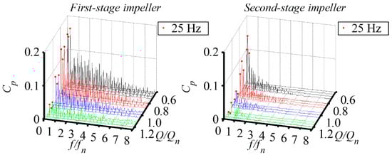 An obvious broadband fluctuation appeared near the trailing edge of both the first-stage impeller and second-stage impeller, as shown in Figure 16. The fluctuation at the trailing edge of the two impellers can be divided into two categories. One is the fluctuation with the frequency of the first harmonic of the RF. The fluctuation amplitudes at the first harmonic of the RF were significantly higher than the other frequencies. The other is the fluctuation with broadband frequency, which can be characterized by a wide bandwidth of the band, and the amplitude decreased as the frequency increased. The bandwidth and fluctuation amplitude of the broadband at the trailing edge in the two impellers under 0.6Qn was significantly higher than that under the other flow rates. As the flow rate increased, both the amplitude and bandwidth of the broadband decreased. Under the 1.2Qn condition, the broadband vanished at the trailing edge of the second-stage impeller, and only fluctuation with BPF and its first harmonic existed.