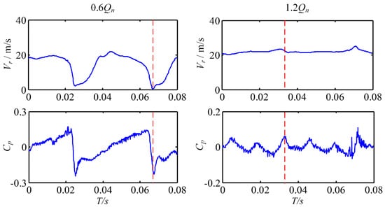 In order to study the causes of the fluctuation with 25 Hz, the flow around the exit of the second-stage impeller under 0.6Qn and 1.2Qn was analyzed. Figure 17 shows the time domain comparison of the pressure coefficient and radial velocity in one rotation period at the monitor point P28. It was found that the radial velocity reached the valley as the pressure dropped to the valley under 0.6Qn when the blade passed through the tongue and the start of the partition. Figure 18 shows the flow details when the blade rotated at the tongue position. It should be noted that the phase difference between the tongue and the start of the partition was π. Therefore, when one blade passed through the tongue, there must have been another blade passing the start of the position at the same time since there were six blades in total; see Figure 18. This is why the fluctuation with the first harmonic of the RF existed in the second-stage impeller near the trailing edge.
