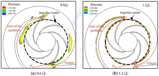 Isosurface of the Q distribution (colored by pressure) in the second-stage impeller and the volute at the moment indicated by the red lines in Figure 17. The black dashed line indicates the position of the impeller outlet. (a) 0.6Qn; (b) 1.2Qn.