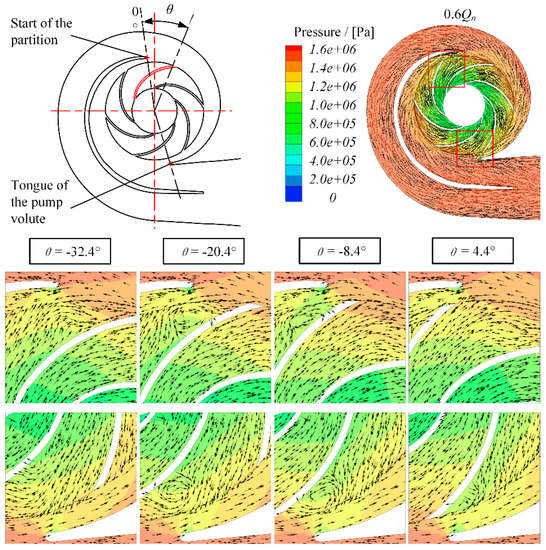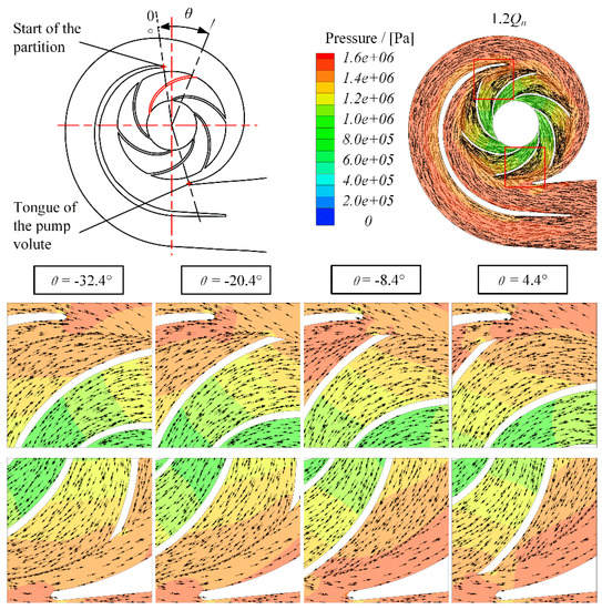 It can be found in Figure 19 that the outflow of the impeller was nonuniform when the blade passed through the tongue and the start of the partition under 0.6Qn. A large size backflow vortex appeared in the blade flow channel. It generated a low-pressure zone between the impeller, volute tongue, and the start of the partition, which made a large pressure difference between the two sides of the tongue and the start of the partition. That is why the pressure at the monitor point P28 dropped suddenly as the blade passed through the tongue and the start of the partition (Figure 17). Affected by the backflow vortex, the radial velocity of the blade was suppressed. Therefore, the fluctuation with the first harmonic of the RF was generated as the blade passed through the tongue and the start of the partition in every rotation period. However, under 1.2Qn, the flow at the impeller outlet was smooth, and the impact of the nonuniform outflow disappeared (Figure 20), which explains the pressure fluctuation performance with the first harmonic of the RF in the second-stage impeller shown in Figure 12.