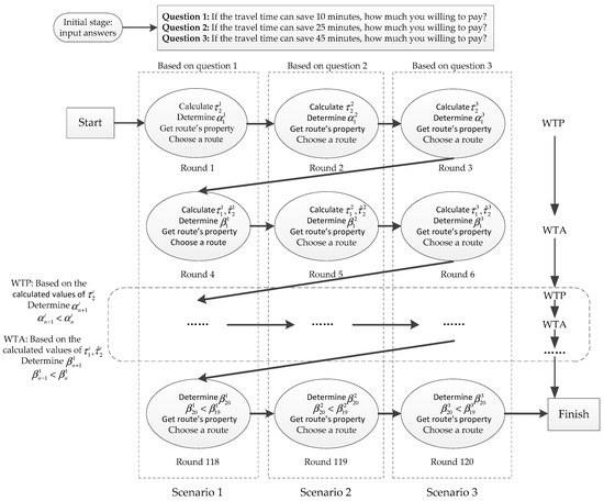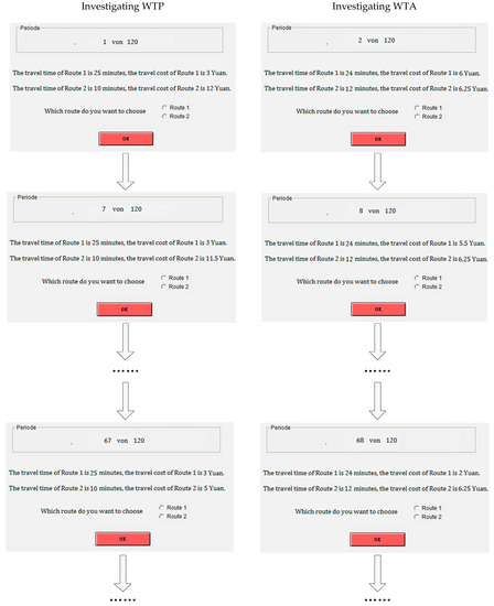 Table 1 is used to investigate participants’ WTP, and Table 2 is used to investigate participants’ WTA. , , and represent travel money costs in the three different travel scenarios, and to note that the values of , , and are calculated based on the participants inputting answers about their WTP at the initial stage of the experiment. Figure 1 shows the experimental design steps. As shown in Figure 1, for a participant, at the initial stage of the experiment they needed to input their answers for “if the travel time can save 10 min, how much you willing to pay”, “if the travel time can save 25 min, how much you willing to pay”, and “if the travel time can save 45 min, how much you willing to pay”. Then, based on the three inputted answers, we can calculate the values of , , and in Table 1 and Table 2. Additionally, from participants’ own points of view, we can get the is equal to , , and (similarly, we can also get the is equal to , , and ; is equal to , , and ). Note that in Table 1 and Table 2 the parameters and are constants, which are appended to the monetary cost, and the and index for the round of experiment. Moreover, as the experiment progressed, there were and . This design ensures that participants will choose Route 1 in the inertial test rounds when investigating their WTP, and they will choose Route 2 in the inertial test rounds when investigating their WTA.