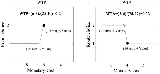 As indicated by Equations (3) and (4), travelers on route would not change to route if the increase in monetary cost is greater than or equal to the right-hand-side value, and the coefficient in Equation (4) is equal to the travelers’ willingness to pay (WTP). Then, based on the above analysis, a route choice experiment will be conducted in the following section to verify travelers’ inertial route choices that resulted from asymmetric preference.