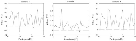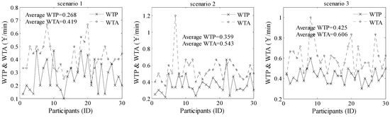 Based on the experimental data, the values of participants’ WTP and WTA can be calculated. Note that the WTP refers to the value of a unit time saving in the case of loss in monetary cost, and WTA refers to the monetary compensation a traveler requires to agree to a unit travel time increase. Thus, in the experiment, the participants’ WTP and WTA can be calculated as shown in Figure 3. It is worth mentioning that, for some participants, their initial stated WTP was different from the experimental WTP, in other words, this means that the result of the report is not equal to the result of the action. Considering the action result can better reflect participants’ psychological index of decision-making, therefore, the experimental WTP and WTA were used in this paper. Figure 4 shows the calculation results. It clearly shows that for most participants, their WTP was smaller than WTA in all of three travel scenarios. This means that for these participants, the monetary compensation for the value of unit travel time increasing is larger than the monetary payment for the same value of unit travel time saving. Moreover, the test of null hypothesis shown in Table 3 suggests that the value of WTP is not equal to the value of WTA.