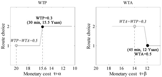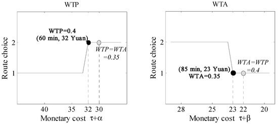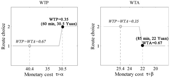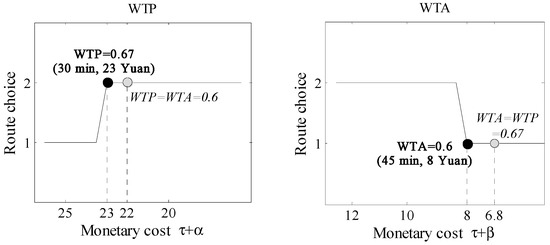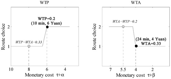 The asymmetric preference describes the phenomenon that travelers might feel different when they made a tradeoff between travel cost and travel time depending on whether they spend money to save time (willingness to pay, WTP) or they bear more time to receive money (willingness to accept, WTA) [33]. While in the conventional study of the value of time, the substitutions between money and time are assumed to be constant. Various theoretical and empirical studies have been developed to examine the value of WTP and WTA as well as to estimate the gap between those two values [34,35,36,37,38]. De Borger and Fosgerau [35] adopted the status quo as the reference state to distinguish travelers’ judgment between gain and loss, and further examined the trade-off between money and time. Their empirical study confirmed the gap between WTP and WTA. However, De Borger and Fosgerau [35] used “wrong choice” to describe travelers’ route choices in their research. In fact, travelers’ route choices were not “wrong”, their behavior was just coinciding with the inertial choice.