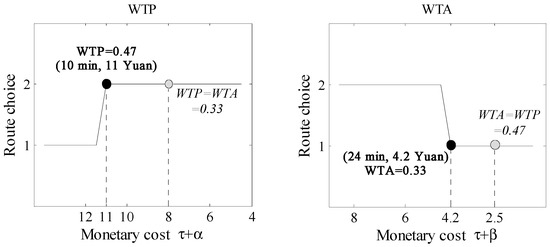 In this subsection, Participant 10 (Scenario 1), Participant 22 (Scenario 2), and Participant 21 (Scenario 3) will be taken as examples, and Figure 8, Figure 9 and Figure 10 show participants’ route choices in the experiment under three different travel scenarios. As shown in Figure 8, in Scenario 1, Participant 10’s WTP equals 0.47 and WTA equals 0.33. Then, assuming that if Participant 10’s WTP equals WTA (i.e., ), they should switch to Route 2 when its travel monetary cost is 8. However, in fact, Participant 10 switches to Route 2 when its travel monetary cost is 11. On the other hand, assuming that if Participant 10’s WTA equals WTP (i.e., ), they should switch to Route 1 when its travel monetary cost is 2.5. However, in fact Participant 10 switches to Route 1 when its travel monetary cost is 4.2. Moreover, for another two participants, similar phenomena can be found in the other two scenarios. Therefore, when participants’ WTP was larger than WTA, the asymmetric preference can make them tend to choose a route with the shortest travel time.