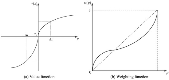 where the parameters , measure the degree of the diminishing sensitivity to change in both directions from the reference point , parameter captures the degree of loss aversion, parameters reflect the level of distortion in the probability judgment. is the probability of an outcome . Figure 11 illustrates the value function and the weighting function. Suppose an alternative denoted by the pair is composed of possible outcomes with probabilities , respectively. Then, the cumulative decision weights are defined as follows: