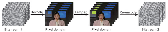Process of tampering with a video. A video is firstly decoded to the pixel domain in which the alteration is done. After editing operations, the video sequence in the pixel domain is re-encoded to a new bitstream. Please note that the decoded pictures are from the “Akiyo” video sequence downloaded from [1].