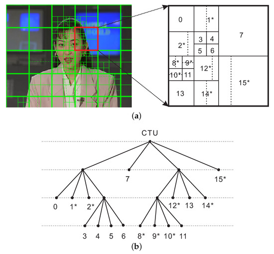 Subdivision of a CTU (Coding Tree Unit) into CUs (Coding Units) (with subsequent Prediction Unit (PU) partitioning marked with an asterisk (*)). Solid lines indicate CU boundaries, and dotted lines indicate PU boundaries. The picture is one of the P frames from the HEVC-encoded “Akiyo” video by HM12.0 [27]. (a) CTU with its partitioning. (b) Corresponding quadtree.