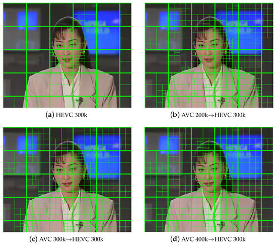 The quadtree-based CU block partitioning structure is designed to adapt to various texture characteristics of images in different encoding cases [28]. In other words, the quadtree-based coding structure can select appropriate CU partitions for regions of different texture complexity. Figure 4a illustrates the CU and PU partitions of one frame from the “Akiyo” video encoded by HEVC. It is observed from the figure that the more complex the texture, the smaller the CU size of the partition, e.g., the face area of “Akiyo”. In this way, the complex region can be encoded with finer coding units and prediction units, thus effectively improving the visual performance of videos.