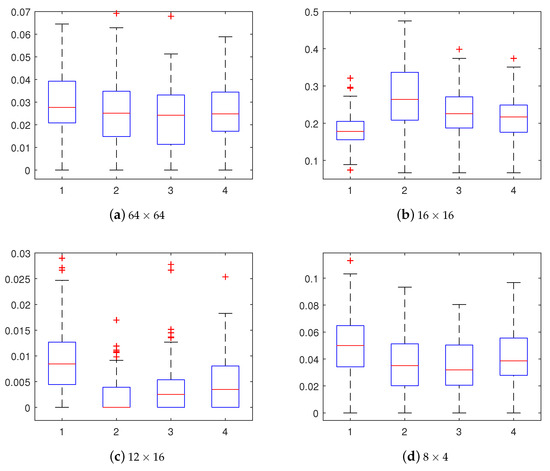 To further analyze the footprints, the frequencies of PUs are calculated for these four types of videos (Figure 4a–d). Figure 5 shows the box diagrams for some PU sizes with the horizontal axis corresponding to these four types of videos. For comparison purposes, four PU sizes are illustrated in this figure, i.e., a large size of , a small size of , a vertical splitting unit of , and a horizontal partitioning unit of . From Figure 5, it is observed that the distributions of PUs are distinguishable between original HEVC videos and transcoded ones. Taking Figure 5b for example, it shows the frequency of PUs of in size for four videos (Video #1–4). As can be seen, the frequencies of PUs differ between the original HEVC videos (Video #1) and the transcoded ones (Video #2–4). Namely, the median value of Video #1 is below , while the medians of Video #2–4 are all above . Besides, the amount of PUs of in size in Video #2–4 is more than that in Video #1, signifying that transcoded HEVC videos tend to split into smaller PUs, which agrees with the observations in Figure 4. However, there are more types of PUs in the statistical analysis of Figure 5, compared to Figure 4, which is based on one single picture. For instance, it can be seen from Figure 5c,d that there are more PUs of and in size in the original HEVC video (#1) than that in the transcoded videos (#2–4). Based on the above analysis of PUs of various sizes, it can be concluded that the frequencies of PUs are distinguishable between original HEVC videos and transcoded ones.