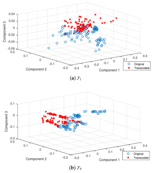 According to the alternative PU sizes, the frequencies of PUs from I frames and P frames are calculated to generate two feature sets of 5D and 25D, respectively, denoted as and . For display purposes, the dimension of the feature sets is reduced by principal component analysis [30] to obtain the first three principal components. Figure 6 shows the representations of these components for feature sets and in the 3D axis. To further analyze the effectiveness of the proposed feature sets, samples of original HEVC videos and that of transcoded ones are both included in this figure for comparison purposes. From these figures, it is observed that the representations of original HEVC videos and transcoded ones can be separated to some extent in the principal component space, which means that the proposed two feature sets are effective at distinguishing original HEVC videos and transcoded ones. More validation experiments are provided in Section 4.