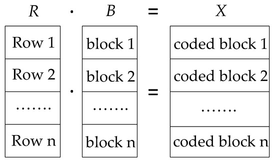 The encoding operation is equivalent to a matrix multiplication (within the finite field GF (28)), where R and B are the random coefficient matrixes, and B is the original data blocks in one batch. The decoding operation is the matrix reversion: .
