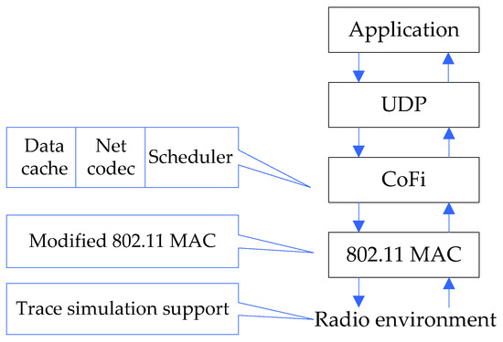 We have implemented the CoFi protocol based on the 802.11 MAC/PHY layer in ns-2 [31], a widely used packet level discrete event simulator. As mentioned above, we suppressed the original per-packet ACK in 802.11, and used per-batch ACK instead. The 802.11 style per-packet retransmission and the exponential backoff schemes are discarded in CoFi. This modified MAC layer interfaces the higher layers through the CoFi encoding/decoding queues (Figure 4).