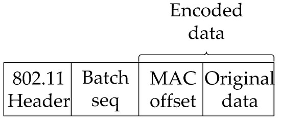 The format of a data packet is illustrated in Figure 5. Beside the legacy 802.11 header, a batch sequence is piggybacked, which is used for triggering the persistent ACK and the transmission of a new batch. In addition, before encoding the original data, an offset sequence must be placed into the data field. This is necessary because the decoding algorithm (Gauss–Jordan elimination) may break the original ordering of packets through matrix row swapping. By encoding the offset sequence together with data, we can recover the transport layer sequence of each packet using its batch sequence and MAC layer offset.