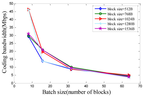 To quantify the computation cost of network coding, we test the average bandwidth of GF () random linear encoding, on a 3.5 GHz desktop PC with 16 GB memory. Figure 6 plots the encoding bandwidth as a function of batch size and block size. Since the encoding always operates over a dense matrix, it tends to dominate the decoding time. Therefore, we focus on encoding bandwidth only. When the batch size is small, the coding bandwidth can be larger than the effective bandwidth of the 802.11 links [34]. Such a result is consistent with existing literature [19]. However, the actual coding bandwidth in our experiment is lower than [19]. This is mainly because our implementation is based on less optimized code. In fact, existing and ongoing work has already exploited fast network encoding/decoding methods, such as hardware accelerated approach [15].