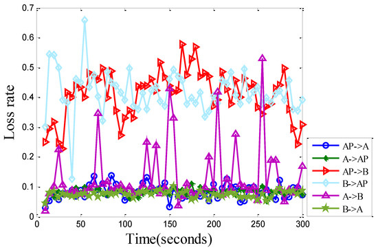 The packet loss rate traces for the 3-node (AP, A, B) topology in Figure 3. Each point represents the average packet loss rate during the past 5 s.