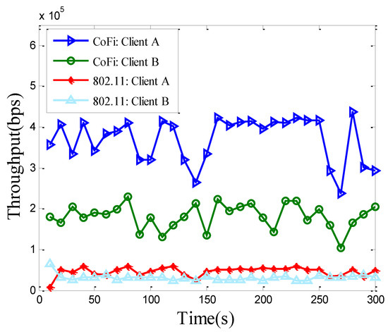 The throughput (averaged over 10-s periods) of each client running 802.11 protocol and CoFi protocol in the elementary topology.