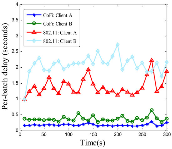 The per-batch delay (averaged over 10-s periods) of each client running 802.11 protocol and CoFi protocol in the elementary topology.