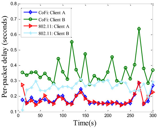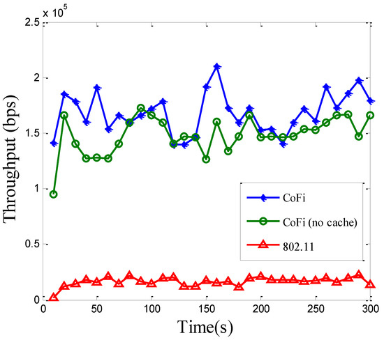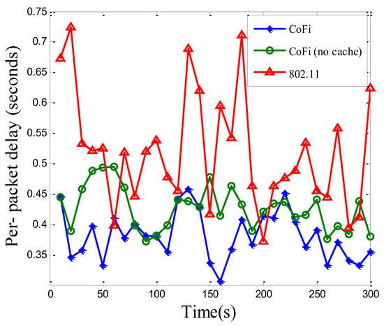 Figure 14 and Figure 15 plot the total network throughput and per-packet delay performance, respectively. Owing to its batch transmission, CoFi with or without MAC caching mechanisms improved the throughput of 802.11 by a significant margin, and the amplitude elevated was slightly superior to the value in the elementary topology. Furthermore, with the use of MAC caching scheme, the throughput was opportunistically improved, according to whether a relay was available nearby. It can be expected that in a dense network with many clients, CoFi will demonstrate even higher throughput gains due to more available relays. Another observation was that the per-packet delay of CoFi could be lower than the 802.11 protocol (Figure 15). This is because when more mobile clients are subscribed to the same AP, the probability that one of them experiences low channel quality becomes higher. Clients with low channel quality could encumber the ones with high channel quality. This will lead to transmission time increasment in the 802.11 protocol. In addition, comparing with the elementary topology, we also observed that the time of per-packet delay increased and the volatility of value is quite large. This indicated that the dynamic topology needs higher level protocol and it is much more complex to be implemented. The results show that the volatility in running CoFi was much smaller than that in the 802.11 protocol, which means the present method is more suitable for application in a practical scenario. Therefore, the case where the low-quality link brings down the performance of the entire network becomes the common case.