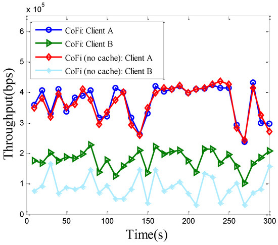 The throughput of each client running CoFi with/without MAC caching in the elementary topology.