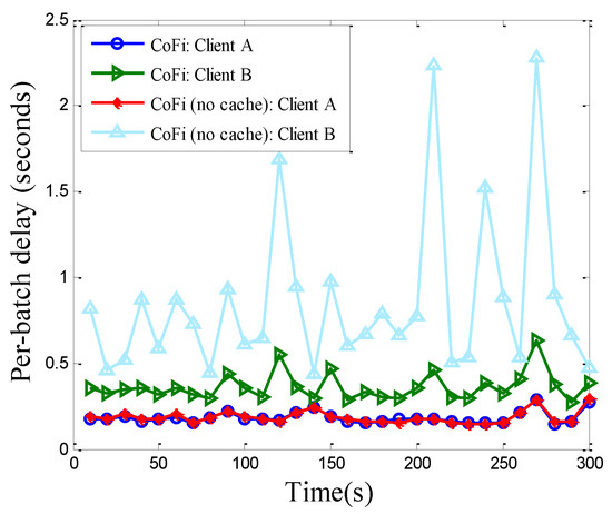 The per-packet delay of each client running CoFi with/without MAC caching in the elementary topology.