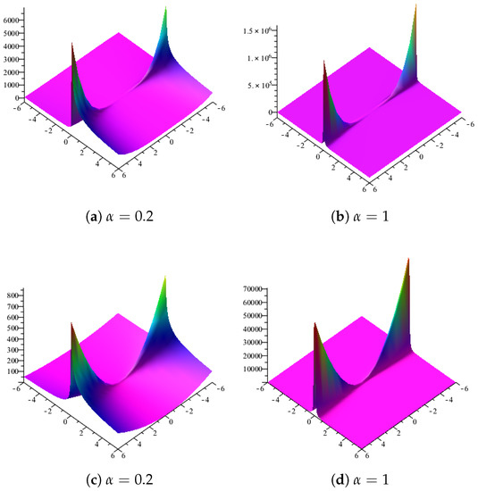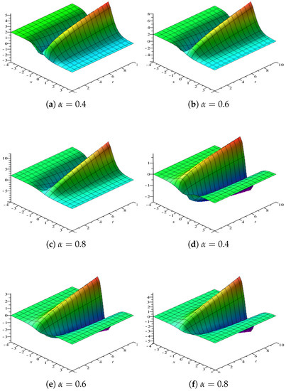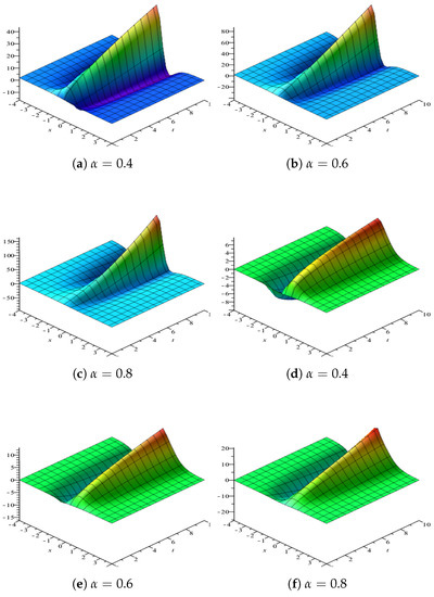 Profiles of the exact solution for the Equation (1) with the same parameters , , , respectively. (a–c) three dimensional plot of u. (d–f) three dimensional plot of v.