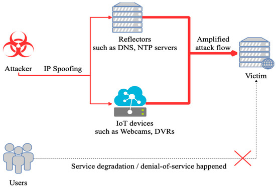 Because the UDP protocol lacks authentication and is stateless, the attacker could easily spoof the source IP address in the request packets. With the high variety of devices in the network nowadays, attackers can launch a valid DRDoS attack using not only numerous DNS/NTP servers but also enormous Internet of Things (IoT) devices. In fact, the most destructive DRDoS attacks around these years are tending to use billions of IoT devices instead of zombie computers [50]. Especially, compared with regular terminals and computers, the IoT devices other than the form of terminals, such as civilian cameras and vending machines, are regarded as less maintained, updated, or patched, leading them vulnerable as the projector of the DRDoS attacks nowadays and in the future. Due to the specifications and technique features, this paper will discuss DRDoS attacks on DNS protocols as the main point, whereas the methodology can also be put into other scenarios with other protocols.